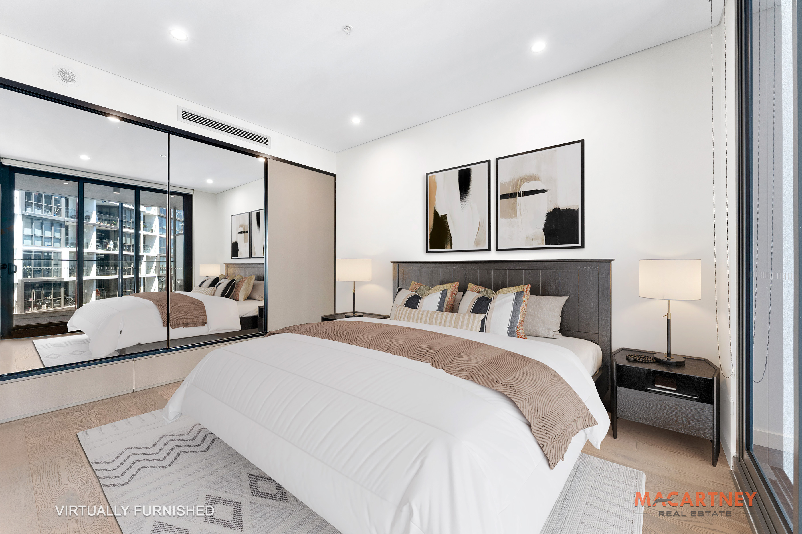 - Oversized high-ceiling bedroom with mirrored built-in wardrobes, generous storage, and balcony access
