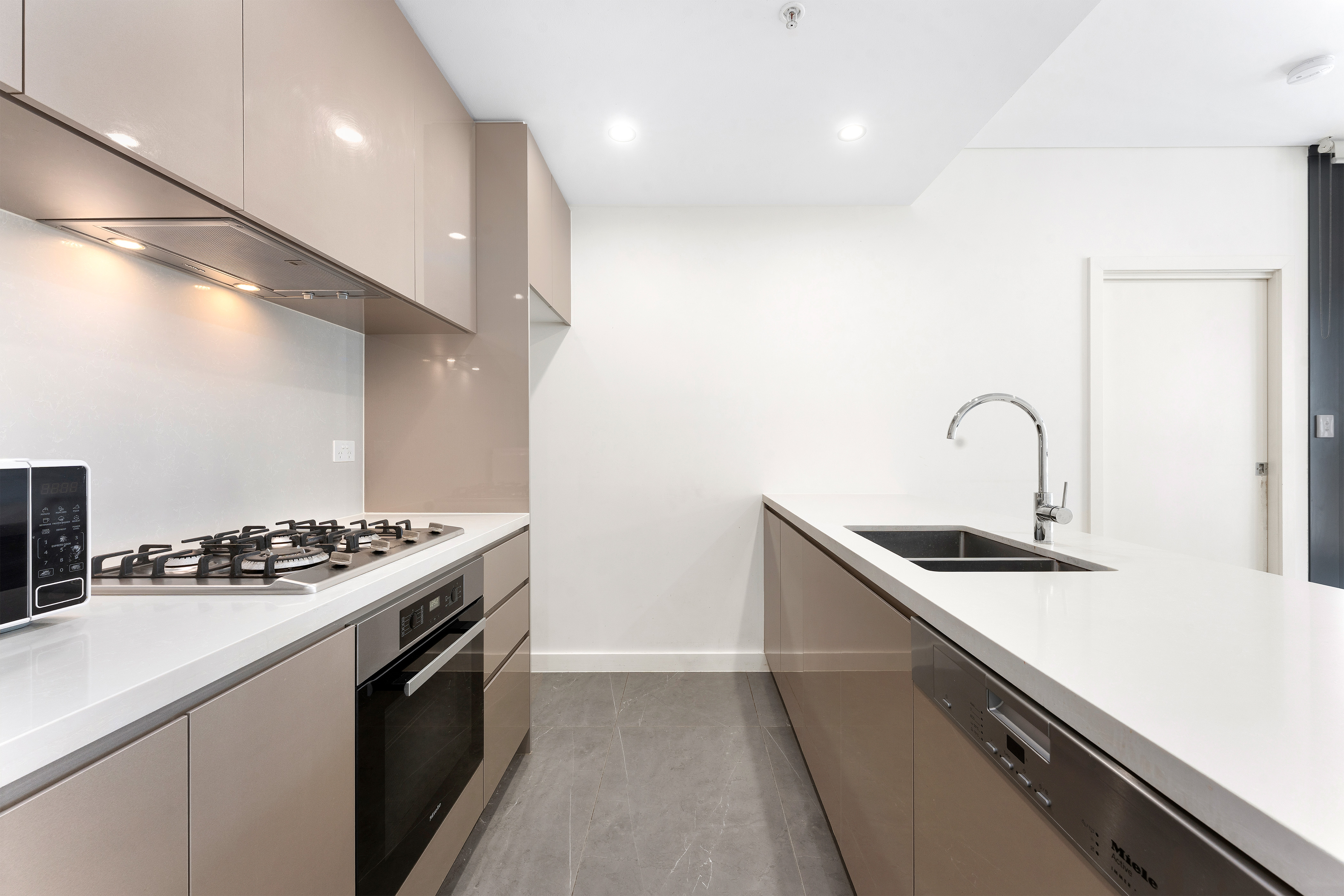 - Gourmet gas kitchen equipped with Miele appliances, stainless steel features, glass splashback, and Caesarstone benchtops, plus integrated dishwasher